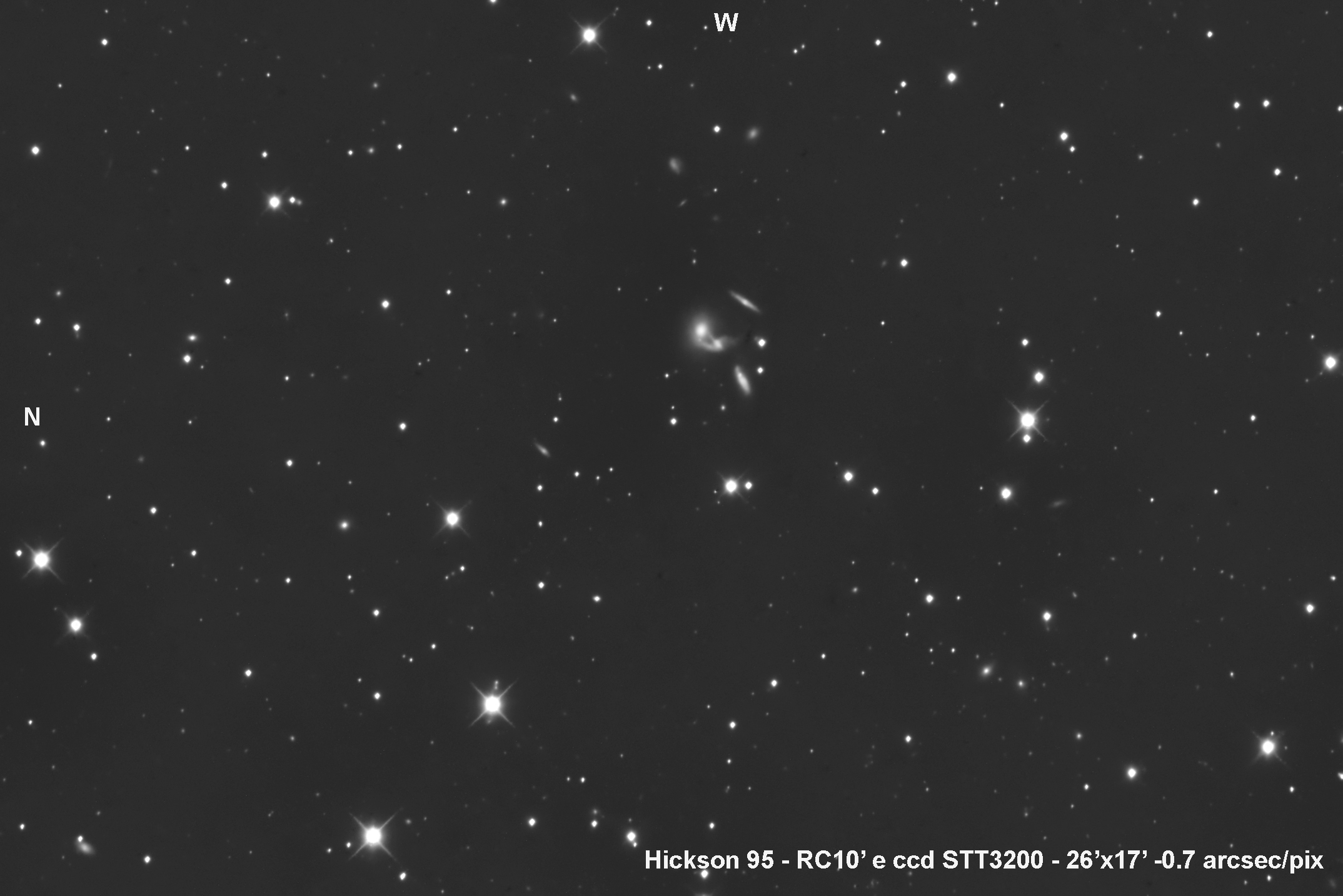 | Si tratta di un quartetto le cui due componenti principali sono unite da due filamenti materia, uno dei quali risulta palesemente asimmetrico rispetto alla morfologia della galassia. La stessa galassia presenta anche una coda di materia che si estende verso sud. La galassia pił a sinistra presenta un cospicuo nodulo sul disco. | |